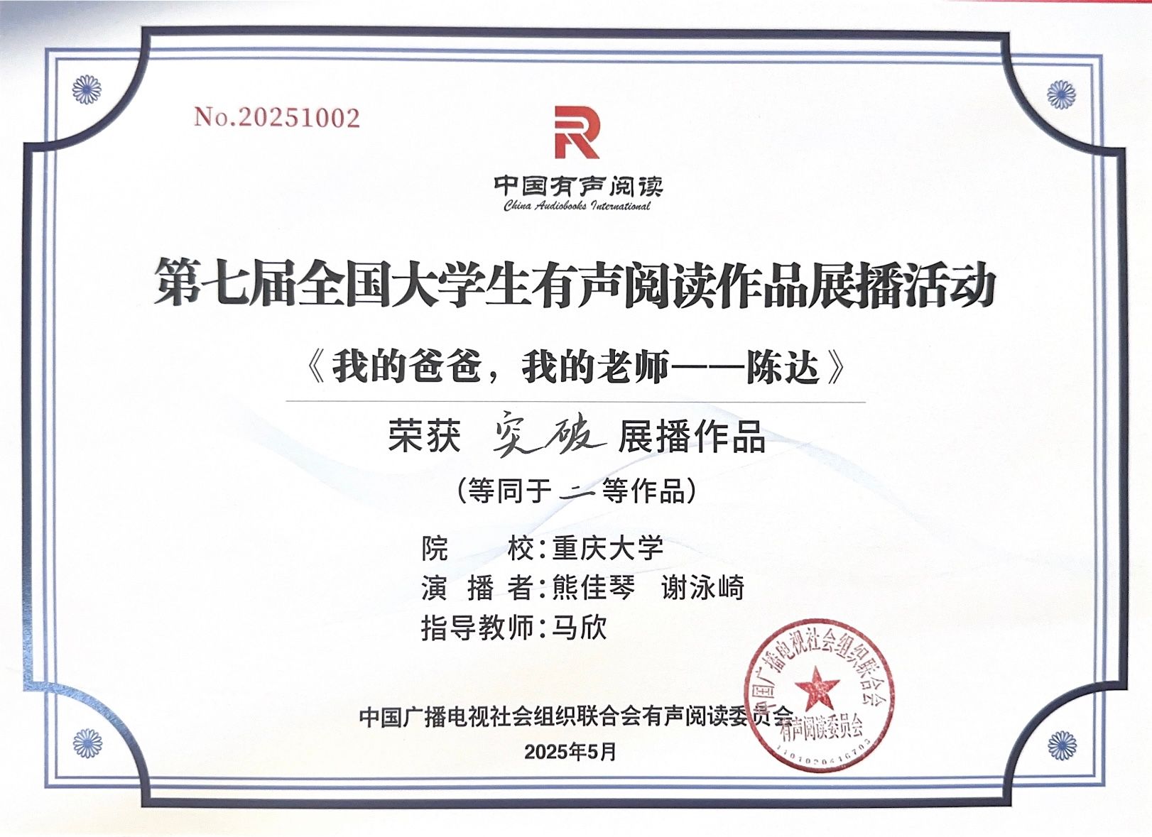 播音主持系作品《我的爸爸、我的老师—陈达》(2022级学生谢泳崎、熊佳琴)晋级全国总决赛,经过激烈角逐,最终获得第七届全国大学生有声阅读大赛二等奖。