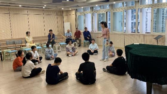 (表演课堂上志愿者引导同学们一起做训练)