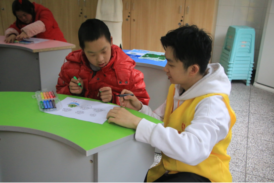 的学生。考虑到智障孩子行动不便,志愿者们想出了一个非常有创意又适合孩子们的纸上植树活动。志愿者们提前几天为孩子们做好了创意绘本,自制有趣的卡通树绘图内容,旨在通过此次活动培养孩子们对大自然的热爱,激发孩子们心中对环境保护的兴趣,让环保的小树苗在孩子们心中生根发芽,一起为地球妈妈添一点绿。